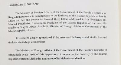 سفیر جمهوری اسلامی ایران در بنگلادش به مناسبت پیروزی حزب ملی گرای بنگلادش برای رهبر این حزب پیام تبریک ارسال کردند